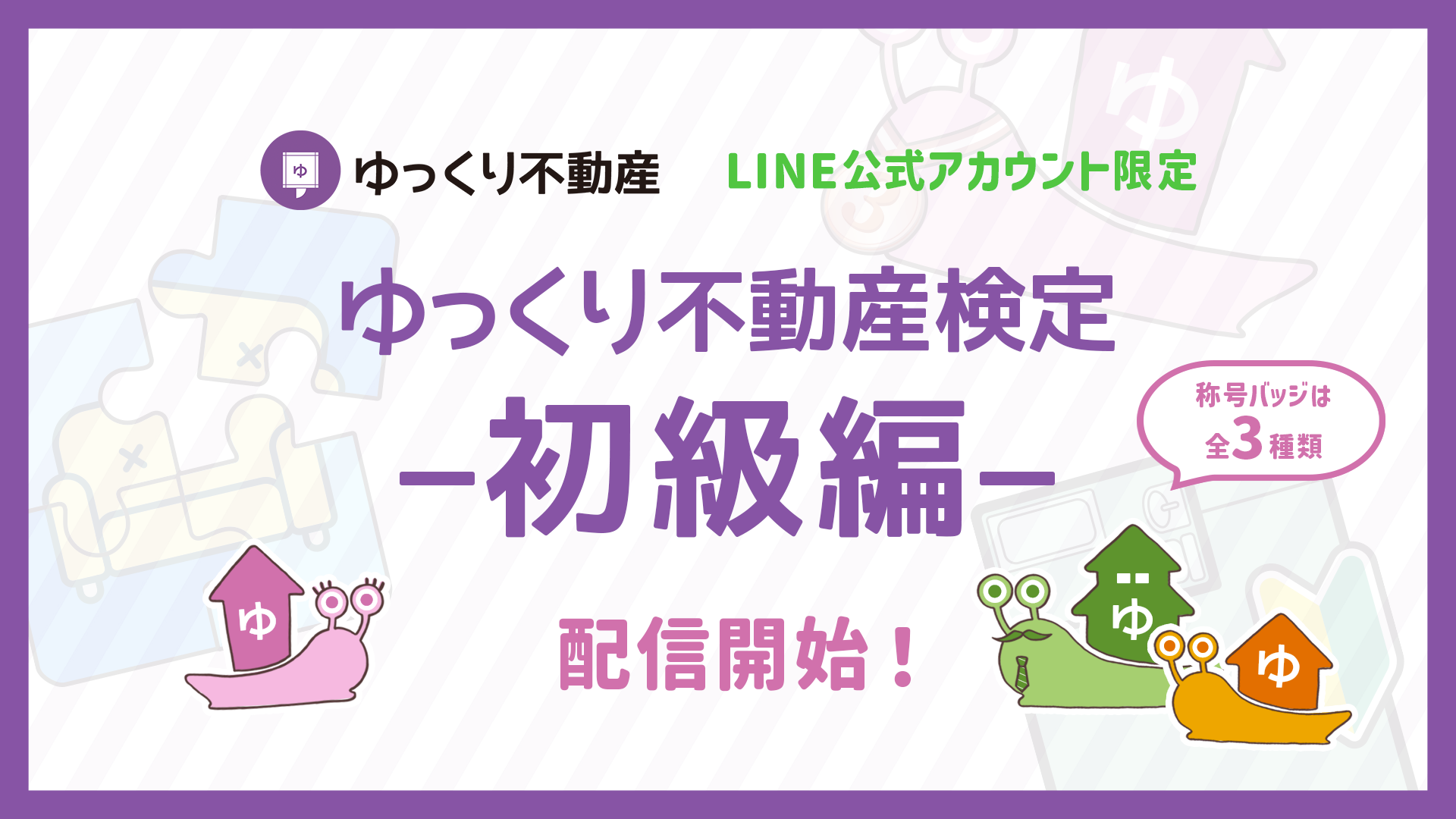 【嬉しいお知らせ】 ゆっくり不動産 LINE公式アカウントにて、 「ゆっくり不動産検定 初級編」ができるようになりました。 この検定では、おなじみのワードやあの有名人にまつわる問題を出題。 今後は「中級編」「上級編」もリリース予定です。 バッジを全種類集めると・・・むふふ。 詳細は、LINE公式アカウント下部のメニュー「ミニゲーム」をタップ!